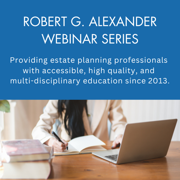 The Robert G. Alexander Webinar Series was introduced in 2013 and provides monthly online programs for viewing live or on-demand (at your leisure). The special programs are available to affiliated local estate planning councils, Accredited Estate Planner® designees, members of affiliated local estate planning councils, and non-members for individual viewing or group gatherings.