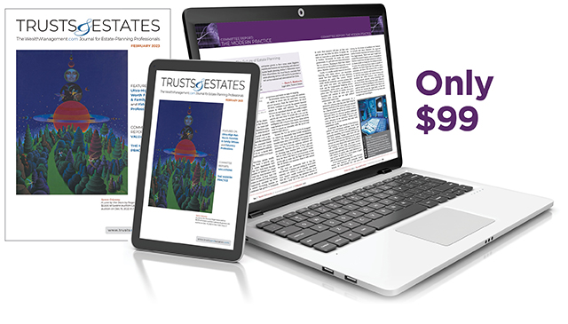 Trusts & Estates' in-depth peer-reviewed articles have made the magazine the authority on estate law, tax issues, and wealth management for over a century. Attorneys, fiduciaries, accountants, investment advisors, charitable giving specialists, family office executives, insurance agents, and valuation experts all contribute their insight and advice to the pages of the magazine. Always with a view to helping you better meet your client's needs. Written by experts for experts!